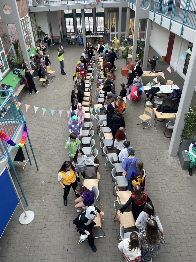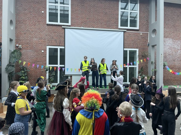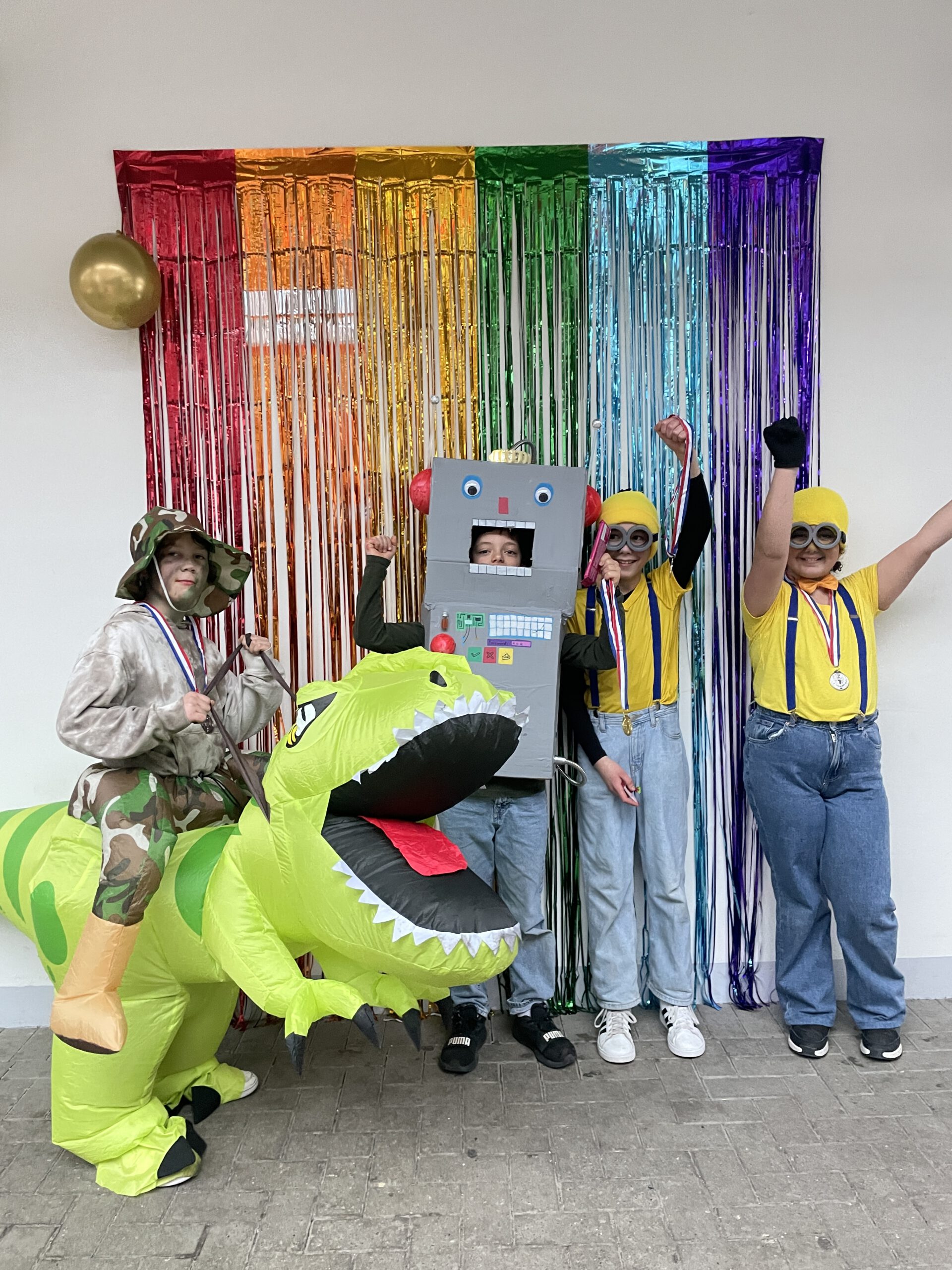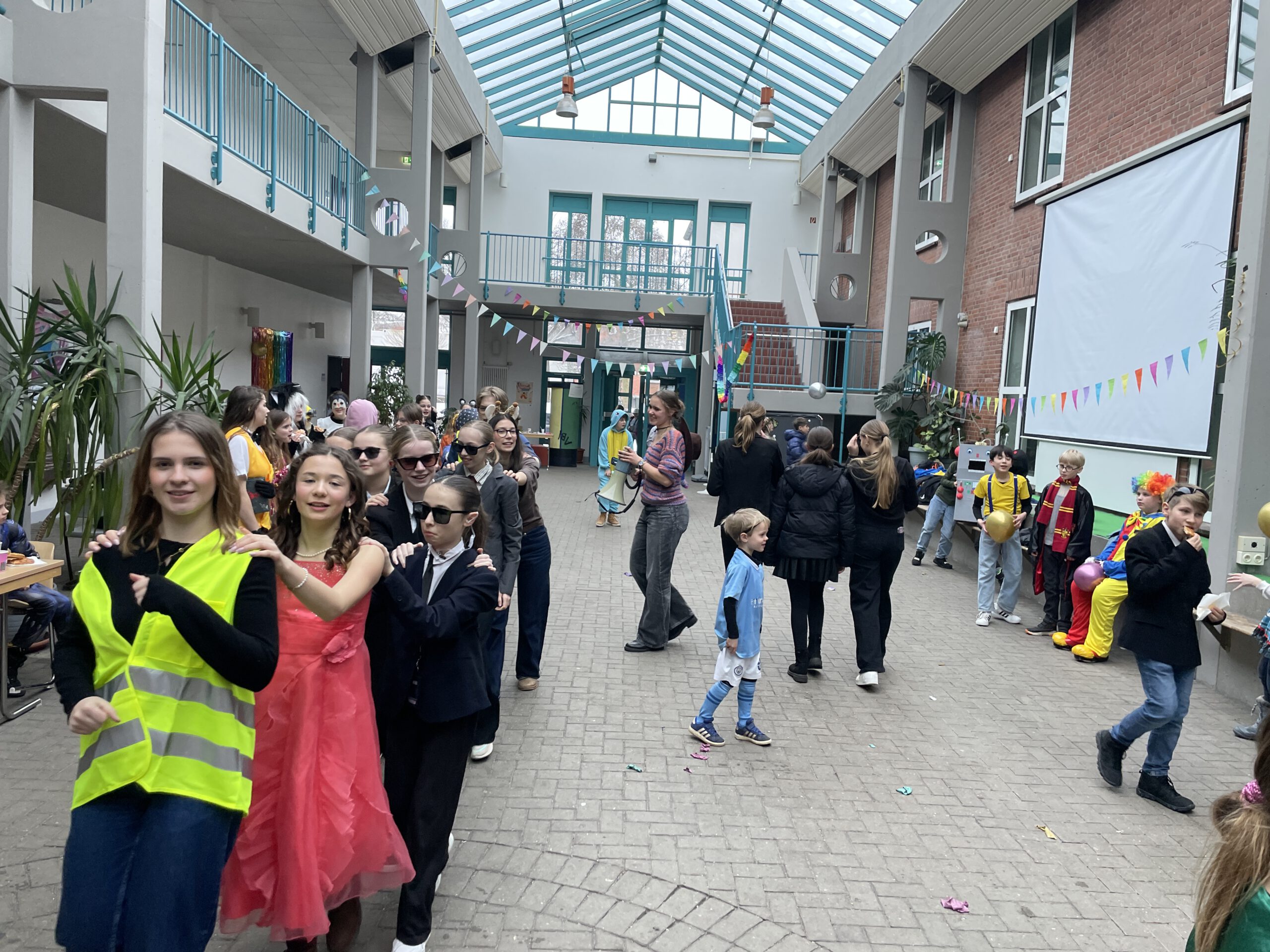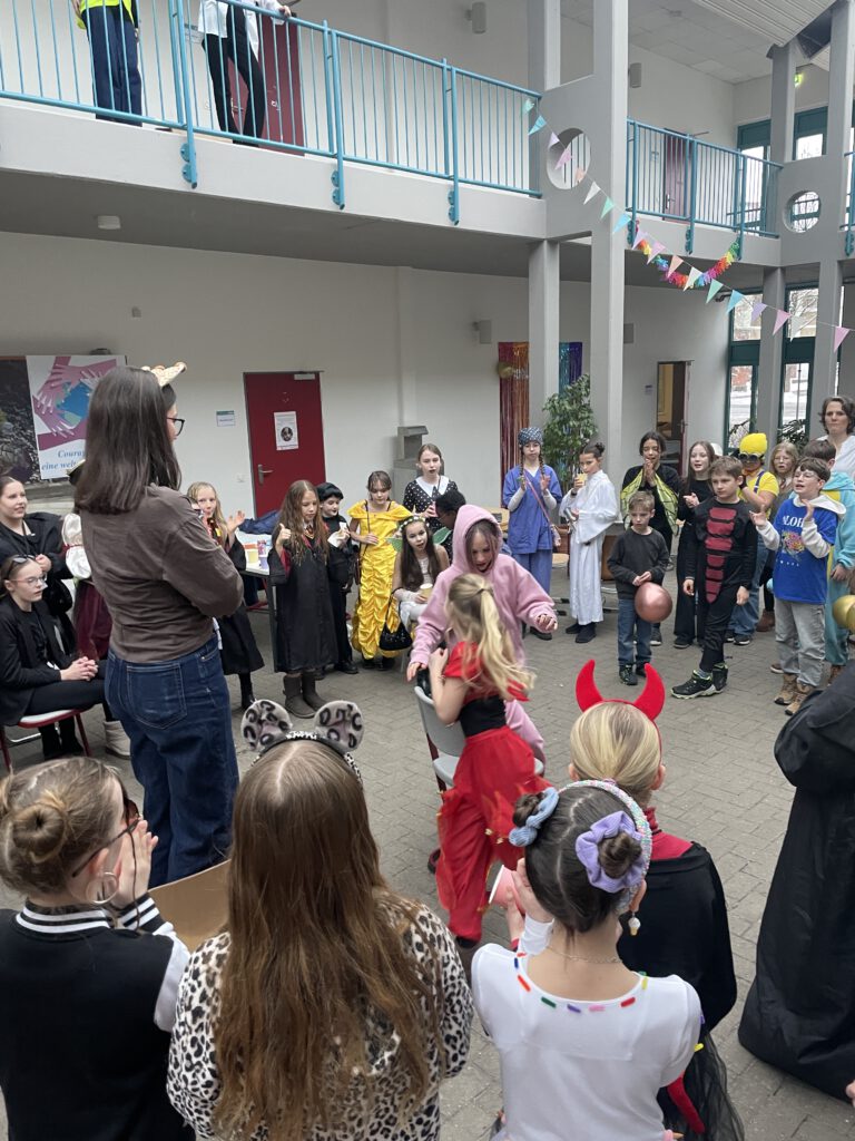 Es haben ca. 80 Kinder der 5.-7. Klassen in kreativen Kostümen zusammen gefeiert, getanzt, gespielt und Pizza gegessen. Alle haben zusammen Stopptanz und Reise nach Jerusalem gespielt und bei einem Kostümwettbewerb wurden vom Publikum die besten Kostüme gekürt. Auf dem 3. Platz ist der Dino gelandet, die Silbermedaille haben die beiden Minons bekommen und die Goldmedaille hat der beeindruckende selbst gebaute Roboter erhalten.