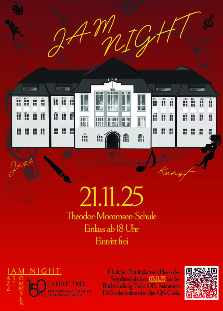 Im Rahmen des Schuljubiläums findet unter dem Motto „Jazz meets Art“ die erste „JAM NIGHT“ der TMS statt. Die Jazzband Swinging Desaster und der Verein der Ehemaligen und Freunde der TMS laden herzlich zu diesem kombinierten musikalisch-künstlerischen Abend in die Aula A und in die Kunsträume der TMS ein. Seid dabei – der Eintritt ist kostenlos!