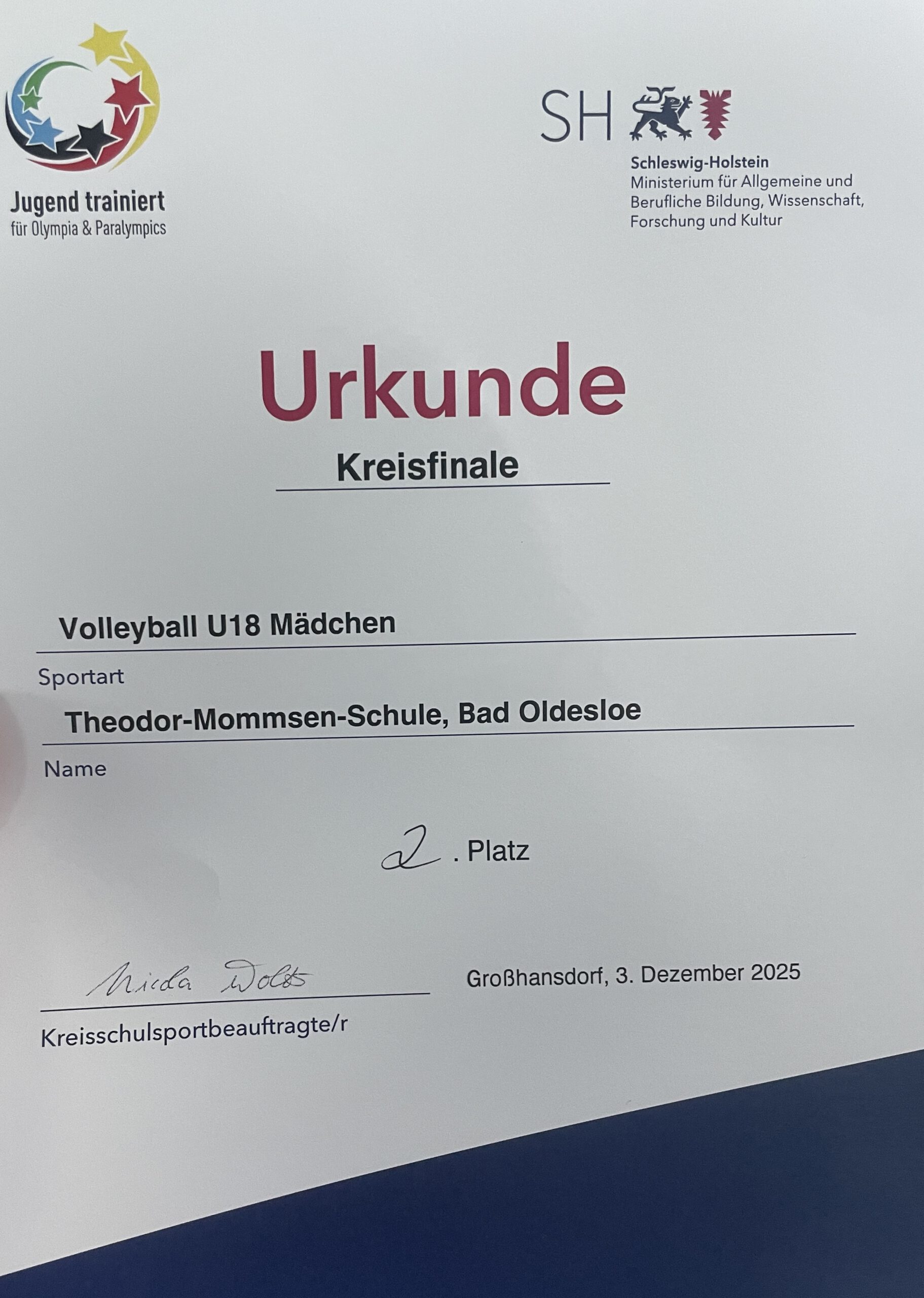 Die Mädchen-Volleyballmannschaft der Theodor-Mommsen-Schule hat am 3.12.2025 am Kreisfinale JtfO U18 in Großhansdorf teilgenommen.