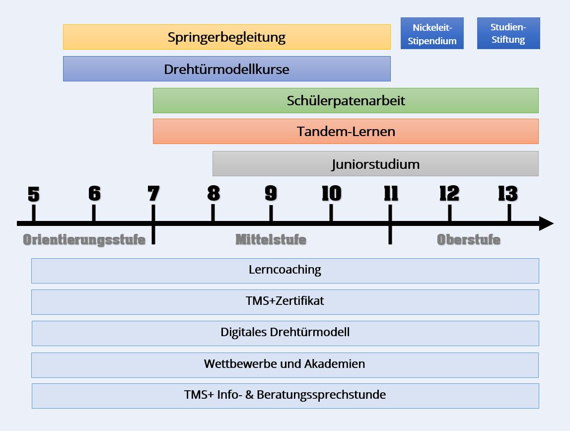Begabten- und Begabungsförderung ist Teil unserer Schulkultur. Mit TMS+ möchten wir Schülerinnen und Schüler dabei unterstützen, ihre Stärken zu entdecken, zu vertiefen und über sich hinauszuwachsen. Unser Ziel ist, zu einer glücklichen und erfüllten Schulzeit beizutragen und den Grundstein für einen selbständigen und erfolgreichen Ausbildungs- und Lebensweg zu legen. Diese Fördermöglichkeiten bietet wir an: