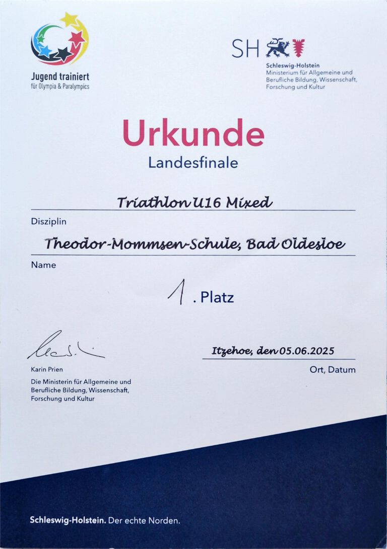 Am 05.06 ging es für die acht Schülerinnen und Schüler Tarja, Jolina, Ida, Fenja, Fiete, Fenris, Antoni und Oskar sowie die begleitenden Lehrkräfte Frau Berlingen und Herrn Braune der Theodor-Mommsen-Schule nach Itzehoe zum „Jugend trainiert für Olympia“ Landesfinale im Triathlon.